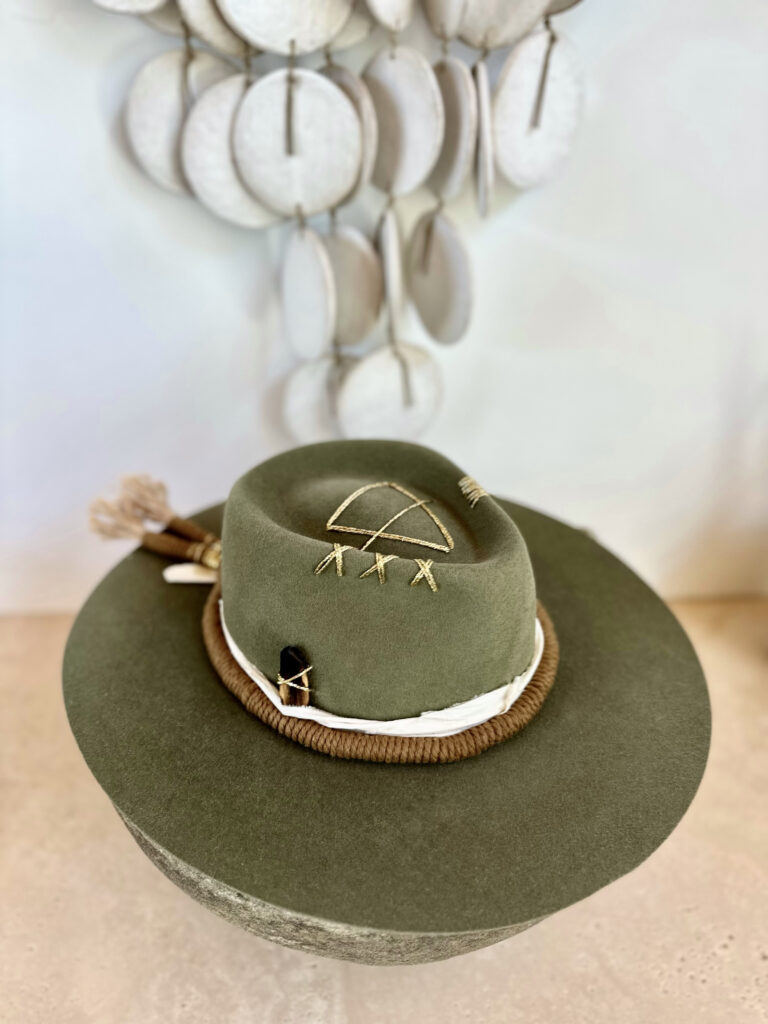 Montana Green felt fedora with gold string accents, Palo Santo, hand-woven sisal and silk band. $450