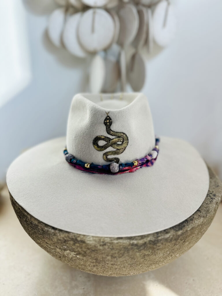 Montana cream color felt fedora with hand-painted snake detailing, silk band, ceramic and metal beads. $450